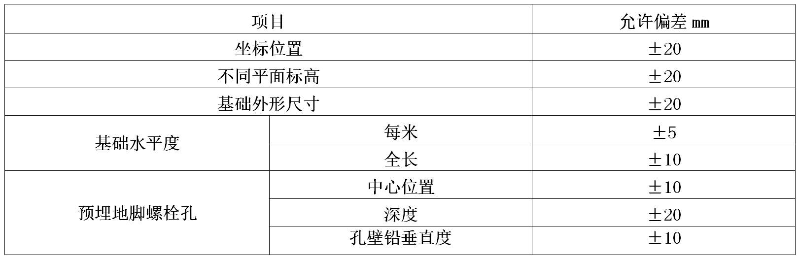 表4. 2.1水泵基礎尺寸允許偏差