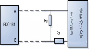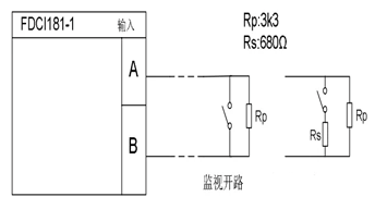 如上圖,AB端引出的兩根線接在被監控設備的干節點觸點兩端(常開或常閉),電阻Rp接在被監控設備端。顧名思義,監控開路就是指當A、B兩根線任何一根與被監控設備的連接中斷就會報開路故障。這也是為什么Rp接在被監控設備端的目的。如果接在輸入模塊端,那么即使連線出現中斷,也不報故障,這樣正常的輸入信號就無法傳遞給輸入模塊,消防主機也無法報出事件。